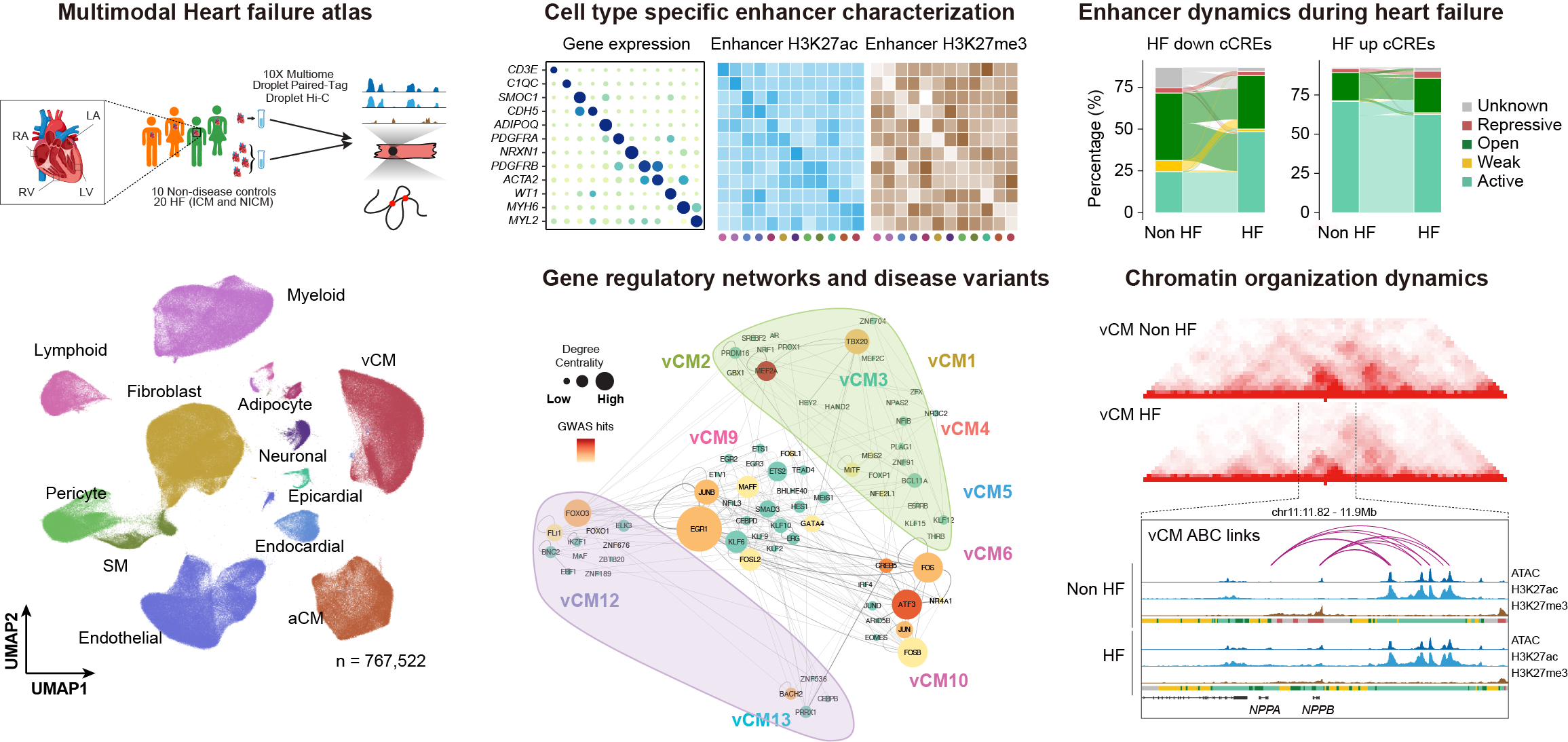 Our multiomic atlas serves as an invaluable, explorable resource (https://epigenome.wustl.edu/HeartEpigenome/) that systematically links non-coding genetic variants to cell type-specific gene regulatory changes, facilitating the interpretation of variants associated with cardiovascular diseases identified by genome-wide association studies (GWAS) and whole-genome sequencing efforts. Thus, our findings significantly advance the fields of human genetics, chromatin biology, and cardiovascular medicine, providing essential insights and resources that will catalyze the development of precise, targeted therapies for heart failure.